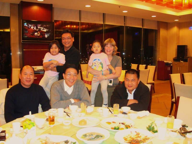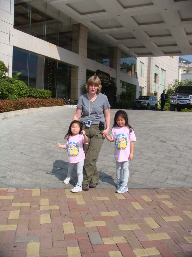 Today we got to really enjoy Yangchun City by relaxing and walking around in the sunshine! Oh yes, my jealous, stuck in the snow friends at home, it’s 25 and sunny again! Getting tired of reading that, aren’t you? (grin) Our hotel is located overlooking East Lake and there is a beautiful public park just below. There is a walking path, with lovely flowers, and the gondola where you can see that we posed for some photos. The area is mountainous and really truly gorgeous! The public park centres around an open square where the locals gather to dance and party in the evenings. It’s huge and well landscaped. The park also has free public exercise equipment, which me and the girls had some fun trying out. You can see by the plaque that Yangchun City has been declared “Top Tourist City in China”, by the government, and for us it’s clear why. It’s clean, safe, and absolutely beautiful. We got up late, so breakfast never happened, but we did find some lunch downstairs in the hotel restaurant. The hotel has a Chinese restaurant (natch) but also a “western” restaurant. So, we thought the kids might like something besides Chinese food and went to check out the menu. Suffice it to say that their definition of “western” food and mine are very different. Totally different. Not on the same planet at all, different. So, Chinese food it was. After lunch meant back outside for some more fresh air and walking. We had to return to the hotel mid afternoon, though, as we were in for a surprise. We were meeting one of Danny’s first cousins for the first time in his life. The man is 60+ years old and Danny has never had the opportunity to meet him. He lives about 3 hours from here, but no one in Danny’s family makes the effort to go and see that part of the family. We decided that since we’re trekking about, two days here, two days there, we might as well go one step further and find them. So, at about 3:30, Danny met his cousin for the first time. It was great. He’s really very nice. A little unsure what to make of me, and my obviously Chinese children who speak only English, but very nice nonetheless. Danny had a chance to have tea with him for a while in the late afternoon and then we had all decided to have a nice dinner together. We stayed here at the hotel, since the food is good, and it is easier than dragging the girls out to another restaurant. We had a great dinner, including fresh scallops, fish fresh from the tank, lovely chicken soup (bird flu, WHAT), and get this - hot corn juice to drink. Yes, seriously, hot corn juice. When they first brought it, I was thinking that sounded kind of nasty. But curiosity got the better of me, so I tried it. It was actually delicious! Nothing other than the juice of fresh corn, no milk, no other ingredients, just hot corn juice. Funny but yummy!! After dinner, the girls put on a show for the other patrons and the wait staff. Keep in mind that China has a strict one-child policy, so two beautiful sisters are really extremely rare for people to see. Add to that the fact that they chatter in English, and love to dance without inhibition in public, and you have some sense of the show! A little boy was desperately trying to play with them! After dinner, the girls and I came back up to the room, and left Danny to chat with the men. The girls are really tired so they hopped into bed with PVR’d movies, and they’re winding down to call it a night. Tomorrow morning, we travel again…..