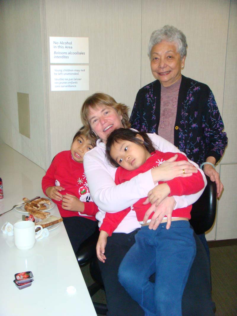 Anyhow.....we got on the flight on time, thanks to my best friend Craig arriving in our driveway, in his chariot (aka a borrowed minivan to carry our 10,000 suitcases, most of which were not mine!). We had arrived at the airport in plenty of time, and made our way quickly to the Air Canada lounge to feed our poor starving children. As you can see by the happy smiles, things were off to a very good start. Emily ate about half a loaf of bread at the lounge, and Stephy enjoyed Frosted Flakes and apple juice, so Air Canada met our food needs. Back to the flight. Yeah, well, we had two bulkhead seats, then the row of three directly behind, because Danny’s mom joined us on the flight. Him and his mom took the bulkhead seats and I ended up sandwiched between the kids in the second row. Before we even got off the ground Emily announced she was tired and fell asleep. Cool, you say? Really great, you think? Not really. Fast, short, early nap and then no more sleep. That’s right, 15.5 hours of flight time and Emily did not sleep again, in spite of the fact that by the time we landed, it was 1am Toronto time. Emily was really funny....when we got out of the airport, she declared “welcome back to Hong Kong”. It was priceless. Stephy started out with more steam, and only napped briefly twice during the flight. By the last couple of hours, she was a RAT. Nasty, cranky behaviour. None of the food suited her. She didn’t want apple juice, until after the cart went past, and then she wanted apple juice IMMEDIATELY. The meals were all kinds of Air Canada specialness. Mystery meat on rice. Mystery meat with noodles. Second meal, instant noodles in a cup, with a sandwich that was just plain meat on a bun. No mayo, lettuce, tomoato, nothing, just meat on a bun. The last meal was another shade of mystery meat on rice, and this time the other mystery came with different shaped pasta. Yeah, you get the drift....filled a gap but not much more than that. Stephanie ate about 15 different snack items that I’d brought with me, including countless packages of cheese and crackers. Emily ate at least 3 servings of the Air Canada chocolate brownie that came with the kids meals. Nope, I don’t care that that’s terrible parenting. So sue me. It kept her quiet and so it was fine. Danny’s mother slept almost the entire flight, but the rest of us were unfortunately awake most of the time. By the time we landed, it was almost 2pm on Saturday December 5th, and by that time, the only good news was that the flight was over, and it was 25 degrees and sunny outside. Oh yeah, I had to throw that out there for you!!! 25 degrees. Did I mention sunshine? Yeah, lots of sunshine. There is a god. She has a sense of fairness. She gave me sunshine and warmth as a reward for surviving the flight. Due to H1N1, we had to complete health questionnaires, and pass through a temperature screening point, but none of us had an issue, so that was fine.