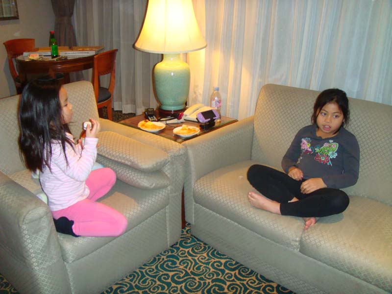 It was funny, because the girls were all about wanting pizza, and it came really quickly. Even still, the day had caught up with us by then. Stephanie ate about half a slice, then fell over, face first, asleep on the chair. Emily did somewhat better, eating one and a half slices, before her face hit the couch. Danny carried them upstairs in the suite to the bedroom. A note about H1N1 and what we’re seeing. In our hotel, every door has floor mates with special notes that say “sanitize every hour”, and even in the elevators, they have a plastic sheet covering all the buttons, and it is changed every hour too. We survived the flight. We’re in Hong Kong and it’s warm and sunny. It’s gonna take a few days to get rid of the unwanted visitor, jetlag, but we’re happy to have got here. |